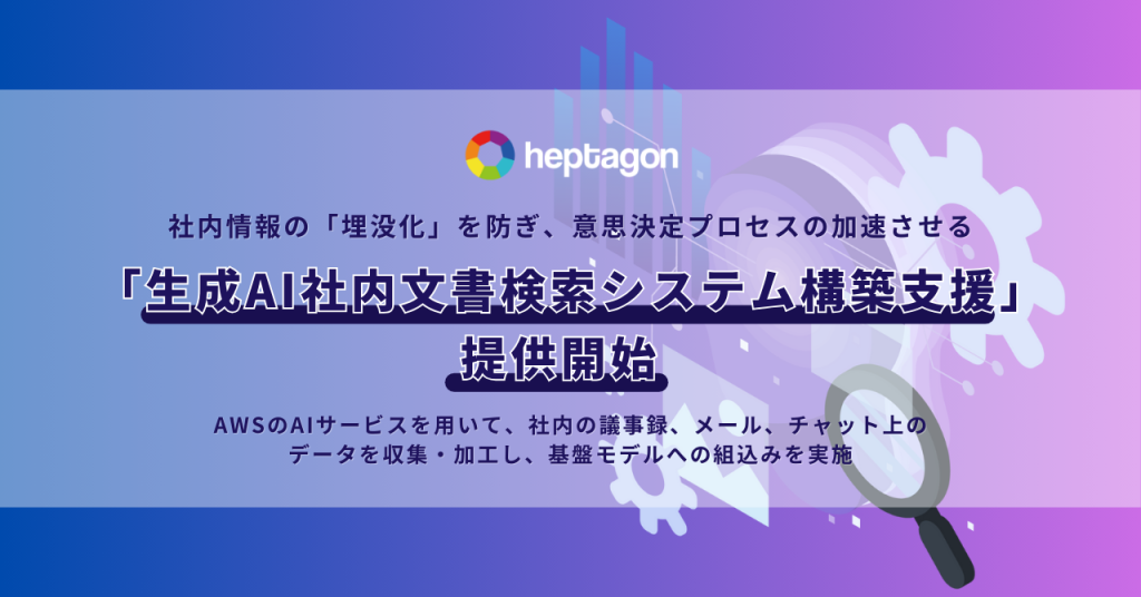 ヘプタゴンの生成AI社内文書検索システム構築支援では、Amazon BedrockやAmazon KendraといったAWSの生成AIサービスを用いて、社内データの利活用を加速、推進するシステムの提案から構築までをワンストップで行います。