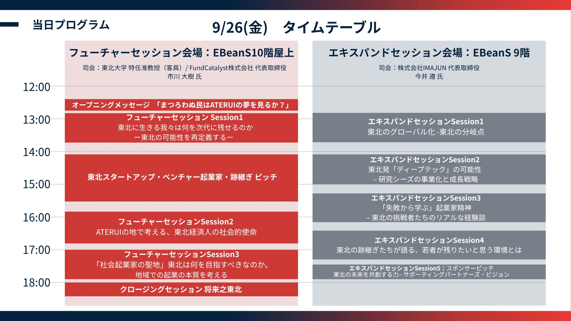 イベントでは、東北の未来と起業に関するトークセッション、地域の起業家によるピッチ、スタートアップ企業の展示やネットワーキングが行えるブースイベントなど、多彩なプログラムが用意されています。この「共創」の場を通じて、参加者同士の想いが交わり、新たな協業やイノベーションが生まれることを目指しています。