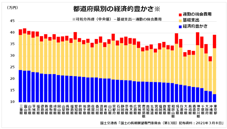ところが、テレワークの浸透はこの“弱点”を一気に帳消しにする。 通勤が不要になれば、東京の“低い豊かさ”は跳ね上がる。地方にとっては追い風どころか、相対的な優位性を奪いかねない“逆風”だ。コロナ禍で語られた「地方の時代」の波が、実際には神奈川・千葉といった首都圏周縁にとどまったのも、この構造が背景にある。