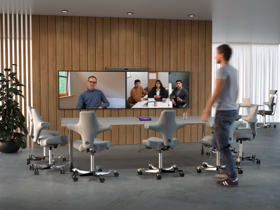 ・会議室の奥にいる方の顔は通常小さく写り、表情が読みとりづらい場合がよくありますが、4KカメラとSymmetry機能で、参加者を自動で追いかけ、顔を大きく、表情を見やすくします。